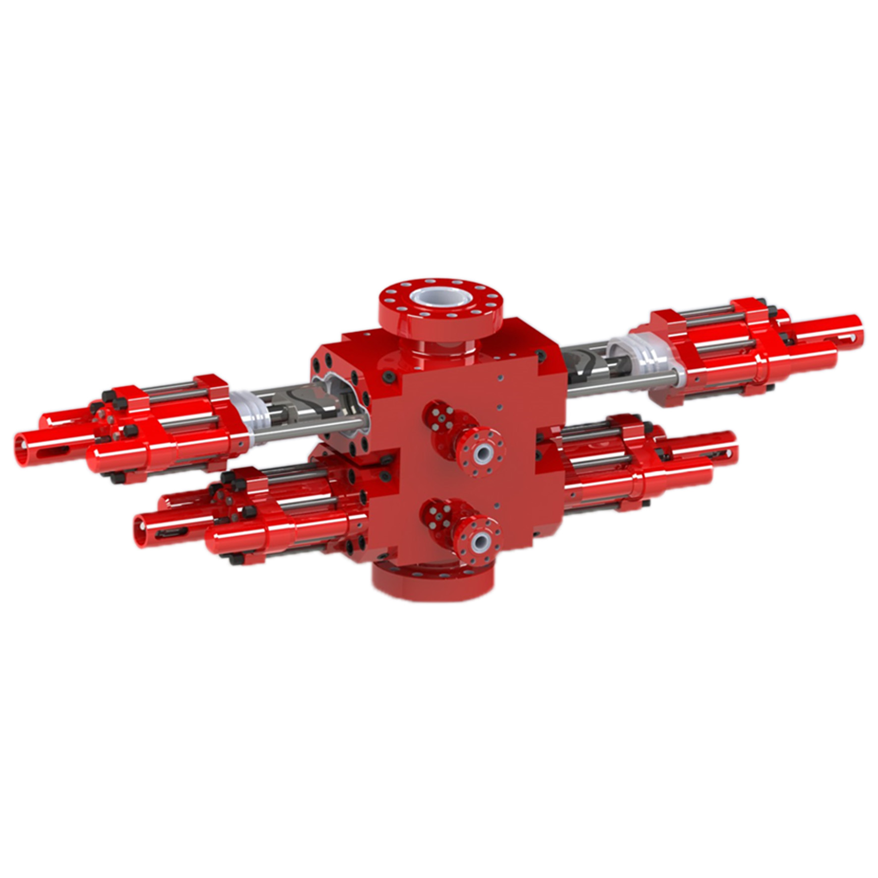 公司自主研发的液压锁紧机构采用新型的楔块式结构,结构紧凑、锁紧刚性强,锁紧位置长,适用性广,解锁容易;能够安全可靠的锁紧变径、剪切等位置不固定的闸板,避免了传统锁紧机构解锁困难与锁紧不可靠的问题。a)侧门与壳体间采用无螺栓连接,使结构紧凑,拆装迅速,快捷高效,安全可靠。b)实现液压缸自锁,使带压作业更安全可靠,减轻劳动强度,提高工作效率。c)提高橡胶件的强度和耐磨性,延长了密封件的使用寿命。